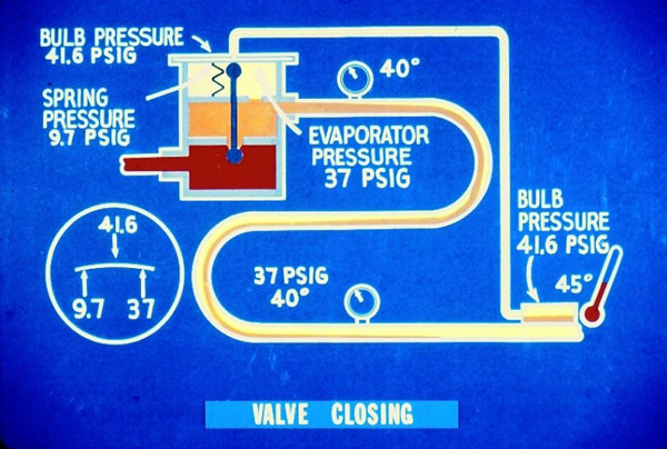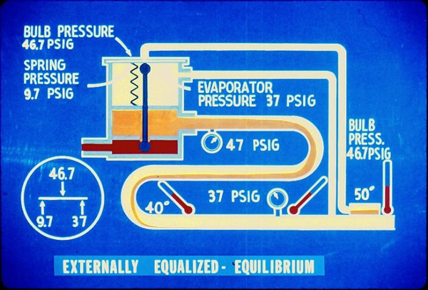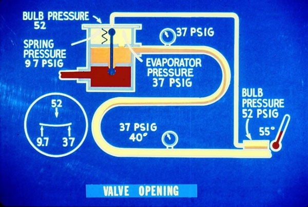 گاز خروجی از اواپراتور 10 درجه فارنهایتسوپرهیت دارد، این مقدار نشان می دهد دمای گاز در انتهای اواپراتور 15 درجه فارنهایتبیشتر از دمای اشباع در فشار اواپراتور است. فشار اواپراتور 37PSIG است که متناظر با دمای 40 درجه فارنهایتاست. از آنجا که گاز 10 درجه فارنهایت سوپر هیت دارد، دما در انتهای اواپراتور برابر است با 40 درجه فارنهایت به اضافه 10 درجه فارنهایت یعنی 50 درجه فارنهایت که توسط دماسنج در شکل اندازه گیری شده است. بنابراین دمای حباب برابر 50 درجه فارنهایت است اگر درون حباب مایع R12 موجود باشد در این دما فشار برابر 46.7PSIG است. این فشار از طریق لوله موئی به قسمت بالای دیافراگم اعمال می شود. فشار بالا و پایین دیافراگم برابر است و شیر در حالت متعادل مقدار باقی از مبرد را به اواپراتور می فرستد. اگر تغییری در نرخ انتقال حرارت به اواپراتور رخ ندهد، شیر همچنان در این وضعیت باقی خواهد ماند.