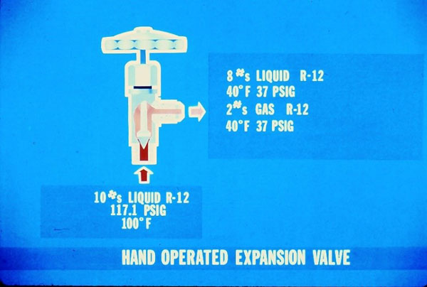 شکل بالا همان شکل قبلی است که مقادر واقعی دما و فشار مبرد به آن اضافه شده است هدف از ارئه این مقادیر شرح و توصیف یک پدیده هم مربوط به دستگاههای تنظیم است که عبارت است از “FLASH GAS ” 10 پوند از مبرد R12 در حال اشباع 1610.1PSIG و 100F وارد شیر انبساط می شود با عبور از شیر دمای مایع 60 درجه فارنهایتکاهش می یابد. همزمان با تغییر دمای مبرد گرما جذب می کند.این جذب گرما با تغییر یا جوشش قسمتی از خود مایع مبد صورت می پذیرد در این مثال 10 پوند مایع وارد و 8 پوند مایع و 2 پوند گاز خارج می شود در حقیقت %2.05 از مایع تبخیر می شود تا دمای باقیمانده مایع به دمای اواپراتور برسد. مایعی که تبخیر می شود ” FLASH GAS ” نامیده می شود. این پدیده در تمام دستگاه های تنظیم رخ می دهد اگرچه در کاربردهای مختلف تفاوت بسیار دارد.