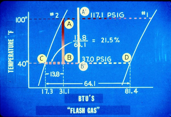 کل حـــرارتی که مبرد در فاصله نقطه C تا نقطه D جذب می کند 64.1BTU است در شکل مشخص است که 13.8BTU (با خط CB نشان داده شده است) صرف سرد کردن باقیمانده مایع از دمای 100 درجه فارنهایت تا دمای 40 درجه فارنهایت شده است از روی شکل می توان دید که 138 تقسیم بر 64.1 مساوی21.5% است بنابراین 21.5% از مایع تبخیر شده است. در واقعیت مقداری اتلاف در حرارت مبرد وجود دارد، انتقال حرارت از شیر، لوله ها و اواپراتور و…. اما در تمام کاربردهای عملی مقدار آنقدر ناچیز است که از آن صرف نظر می کنم.
