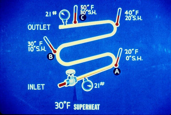 قبل از اینکه شیر انبساط ترموستاتیک را بررسی کنیم باید بحث کوتاهی در مورد سوپرهیت داشته باشیم شکل یک اواپراتور لوله ای ساده را بهمراه یک شیر دستی نشان می دهد فرض کنیم در لوله افت فشار نداریم پس فشار در اواپراتور ثابت است اگر شیر کمی باز شود مقدار کمی مبرد وارد اواپراتور می شود گرما از طریق لوله به مبرد خواهد رسید و انرا تبخیر می کند اگر مبرد فقط در مقدار کم وارد شده باشد در یک نقطه مثل A کاملاً تبخیر خواهد شد در این مثال فرض خواهیم کرد فشار 21psig باشد دمای اشباع در این فشار 20f است. از نقطه A به بعد تنها گاز داریم و هر جذب گرما باعث سوپر هیت خواهد شد سوپر هیت تفاوت بین دمای واقعی گاز و دمای اشباع گاز است دمای اشباع دمای تبخیر مبرد در یک فشار معین است در B دمای گاز 30 درجه فارنهایت است پس 10 درجه فارنهایت سوپر هیت داریم. در اخرین خم لوله دما 40 درجه فارنهایتاست و سوپر هیت برابر 20 درجه فارنهایت خواهد بود در C اختلاف دما بین دمای واقعی 50 درجه فارنهایتو دمای اشباع 20 درجه فارنهایت، برابر با 30 درجه فارنهایت سوپر هیت است.