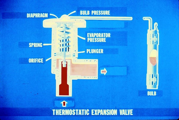 بدون تردید متداول ترین دستگاه تنظیم، شیر انبساط ترموستاتیک است. این شیر جریان تبرید را با حفظ یک سوپرهیت تقریباً ثابت در خروجی اواپراتور تنظیم می کند اگر به این نوع شیر بیشترین کاربرد را دارد، با این حال در میان دستگاههای تنظیم فهمیدن آن مشکلتر از سایر انواع است. شکل مقابل یک برش از شیر انبساط ترموستاتیک است که اجزای اصلی مشخص شده اند. نیروی محرکه برروی پلانچر در شکل مورد تائید قرار گرفته است. نیروها عبارتند از نیروی فشاری فنر و فشار اواپراتور بر سطح پایین دیافراگم و فشار بالب (حباب) بر سطح بالای دیافراگم، فشار اواپراتور از راه یک دریچه داخلی به سطح پایین دیافراگم می رسد به این نوع از شیر ” شیر متعادل شده داخلی ” می گویند.